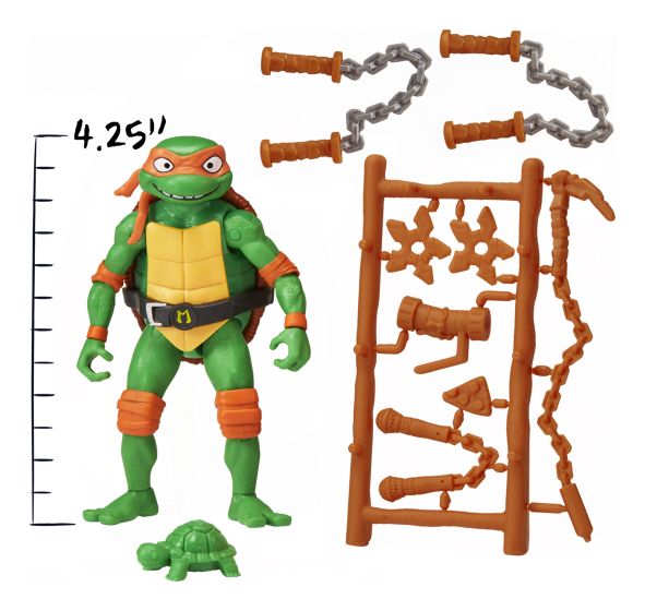 Get ready for the Mutant Mayhem figures and accessories, based on the new CG animated Teenage Mutant Ninja Turtles movie! Tap-tap-Is this thing on? Mikey's the funny one of the group or at least he thinks so! (Sometimes his brothers are a tough crowd.) With some training from his rat-dad Splinter, Michelangelo and his brothers are finally ready to venture into the big city, where Mikey can test out his material. Nothing will come between him and his dream to be a stand-up comedian, even if the only positive feedback he's getting is from the microphone! Michelangelo figure is 4.25" tall and designed to match his movie character. Set includes his iconic nunchaku and comes in a unique Mutant Mayhem package!